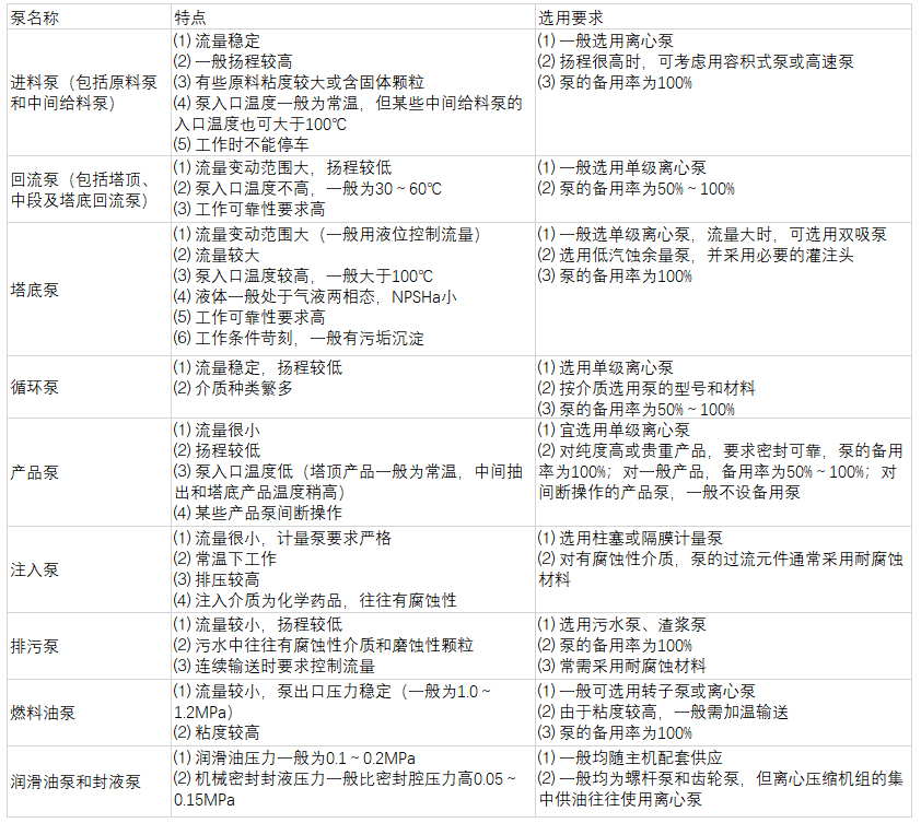化工生產(chǎn)工藝流程中的典型用泵有:進(jìn)料泵、回流泵、塔底泵、循環(huán)泵、產(chǎn)品泵、注入泵、補(bǔ)給泵、沖洗泵、排污泵、燃料油泵、潤(rùn)滑油泵和封液泵等,其特點(diǎn)和選用要求見(jiàn)下表。