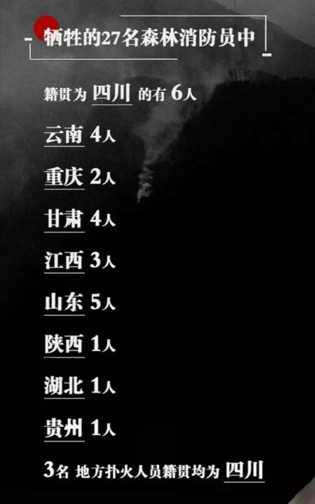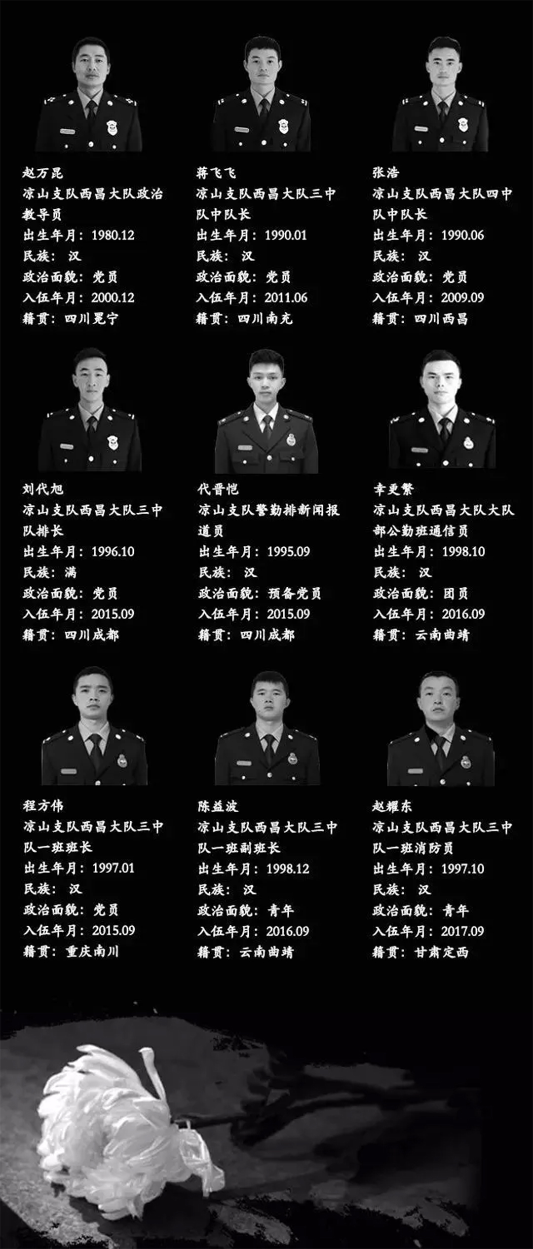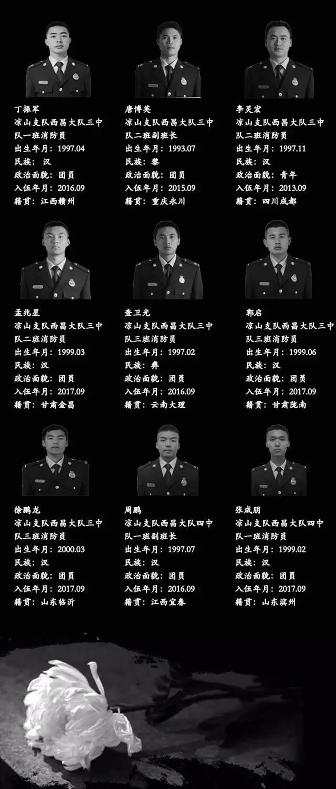 這是一場(chǎng)慘烈的“斗爭(zhēng)”,為了拯救人民財(cái)產(chǎn)、動(dòng)植物等的犧牲,這是一份沉重的名單,經(jīng)統(tǒng)計(jì)核實(shí),有27名同志系涼山州森林消防支隊(duì)指戰(zhàn)員。27人中有干部4人、消防員23人。漢族22人、滿族1人、黎族1人、彝族2人、畬族1人。1980年后出生1人,1990年后出生24人,2000年后出生2人,年齡最小為2000年7月出生。中共黨員9人(含預(yù)備黨員1人),共青團(tuán)員11人,青年7人。