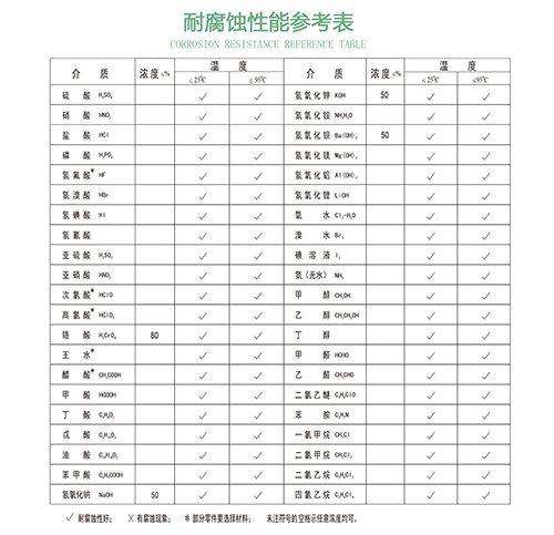 襯氟泵具有廣泛的耐腐蝕性。F46材料的耐腐蝕范圍具體可參考下圖《氟塑料泵耐腐蝕參數(shù)表》。